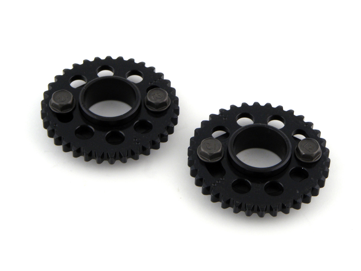 The CNC machined APE adapters are pressed on the cams in place of the non-adjustable OEM sprocket. Then the slotted sprockets can be adjusted. An easy way to unlock additional horsepower by timing your cams for optimal performance. All assemblies include two adapters, adjustable sprockets, and four bolts.