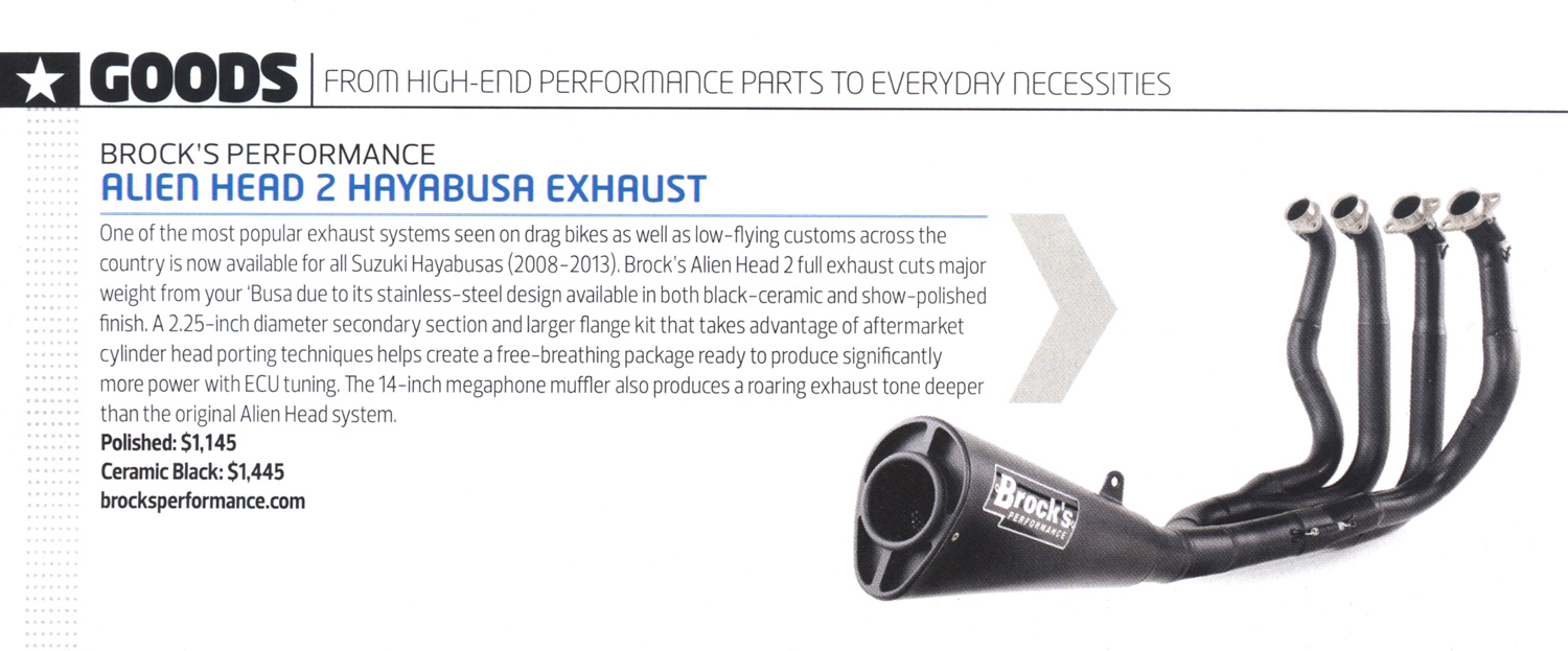 The Alien Head 2™ exhaust system combines our legendary, race-proven performance with the distinctive look and deeper tone than the original Alien Head™ muffler, which has become a favorite with custom builders to showcase more of today’s big tire/custom swingarms. Manufactured to stringent specifications, Brock personally designed and hand-tuned the Alien Head 2™ full exhaust system to find the ideal balance of performance and attitude for the stock to highly modified Busa.