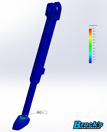 The simulation below is showing a billet adjustable kickstand assembly (Ninja H2 used in test) undergoing stress analysis. It is using the wet weight of the bike (530 lb) plus the weight of a rider sitting on the bike (250 lb).